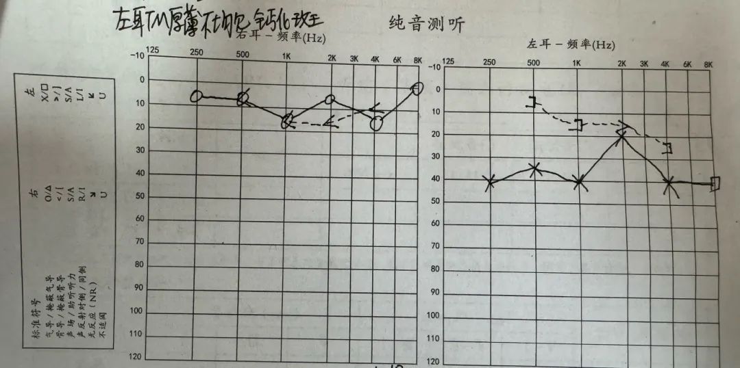 湯洪醫生為其進行了查體及相關檢查,查體顯示耳內無膿液,純音聽檢查顯示:右側平均聽閾值10dB,左側平均聽閾值34dB。
